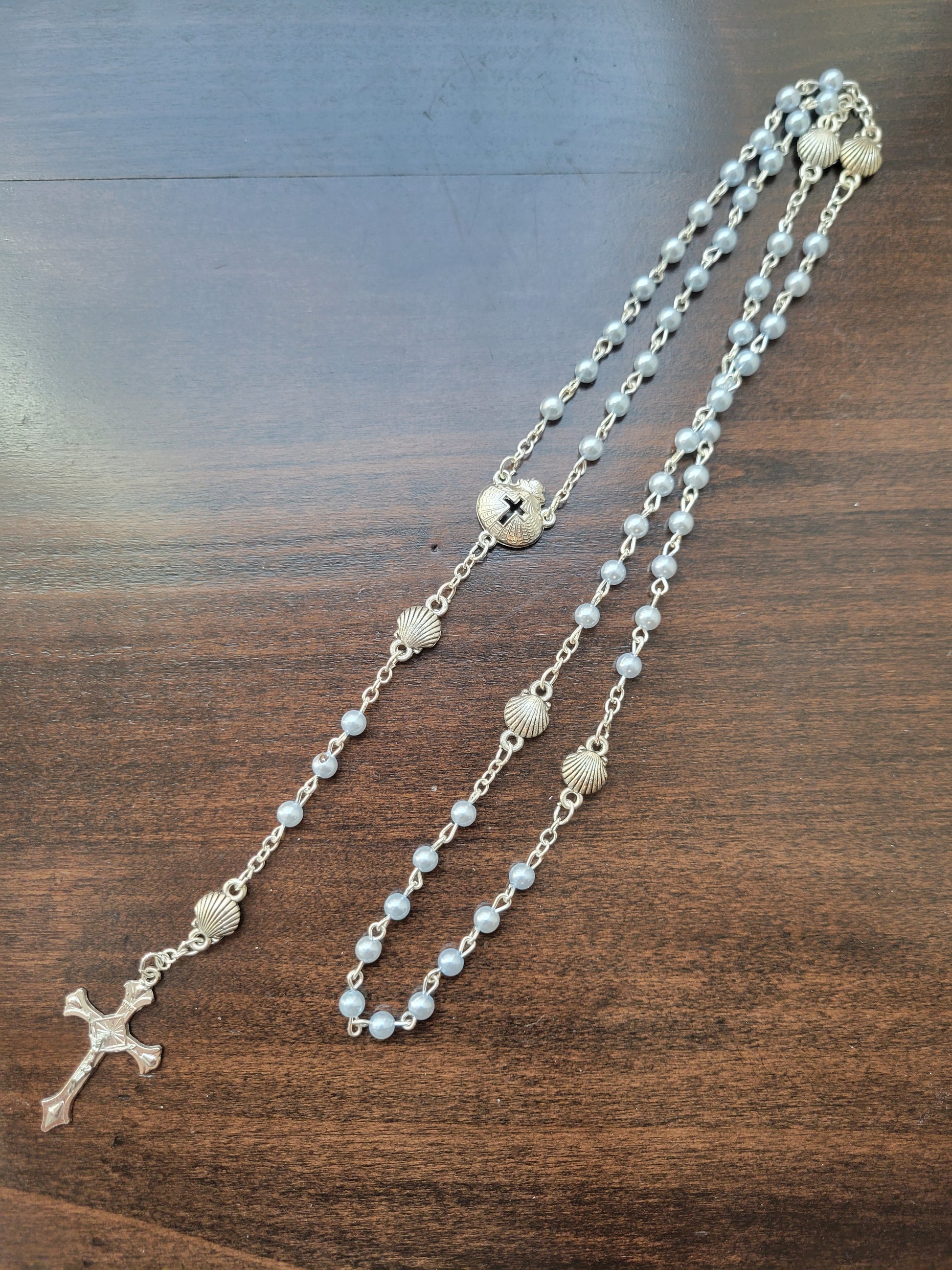 4MM Blue Pearl Beads with silver ox Baptism Shell, Our Father Beads and center