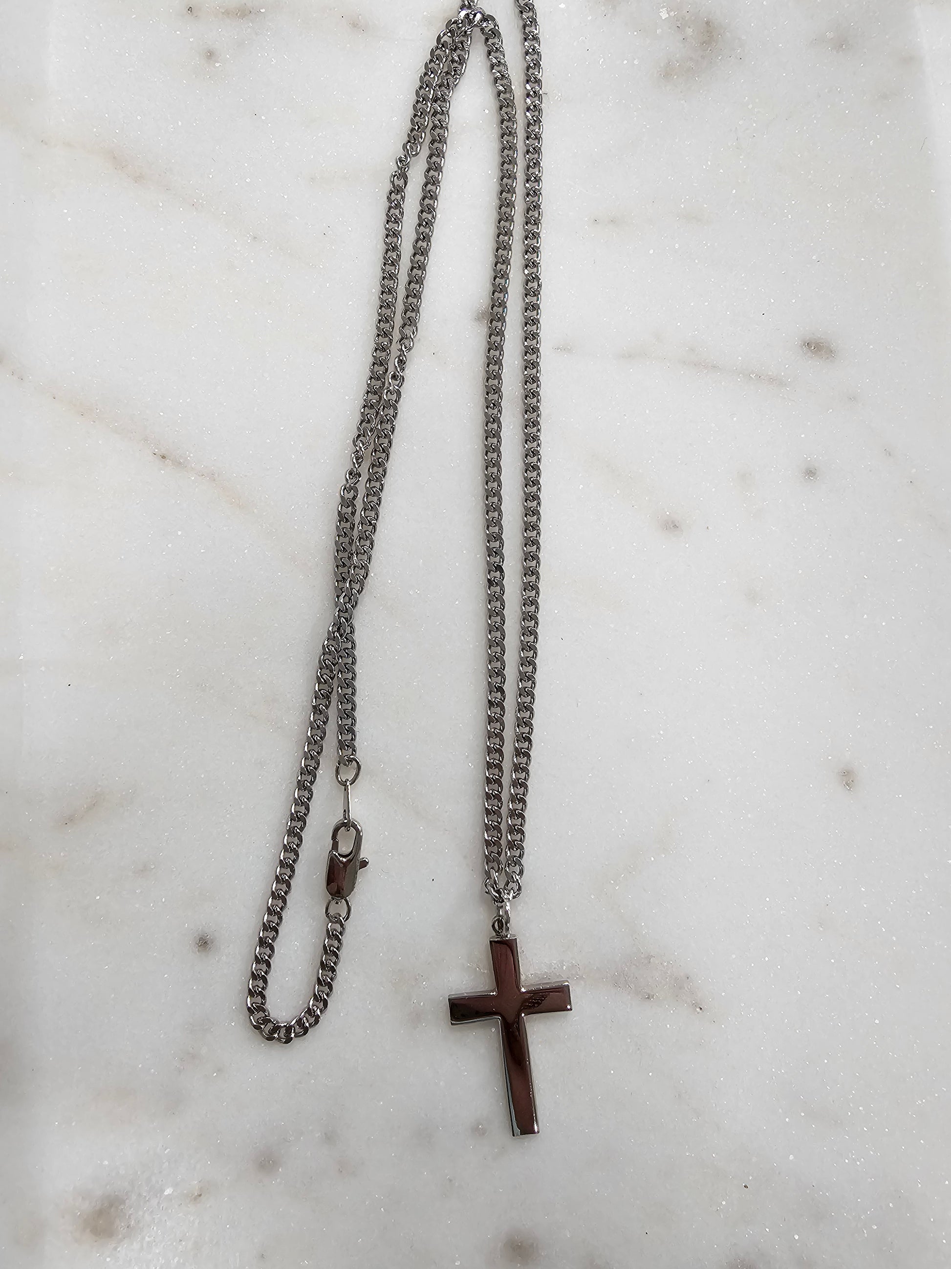 This rhodium finish over pewter cross would make an excellent gift for men of all ages. It comes on a 24" stainless steel chain and clear top gift box,