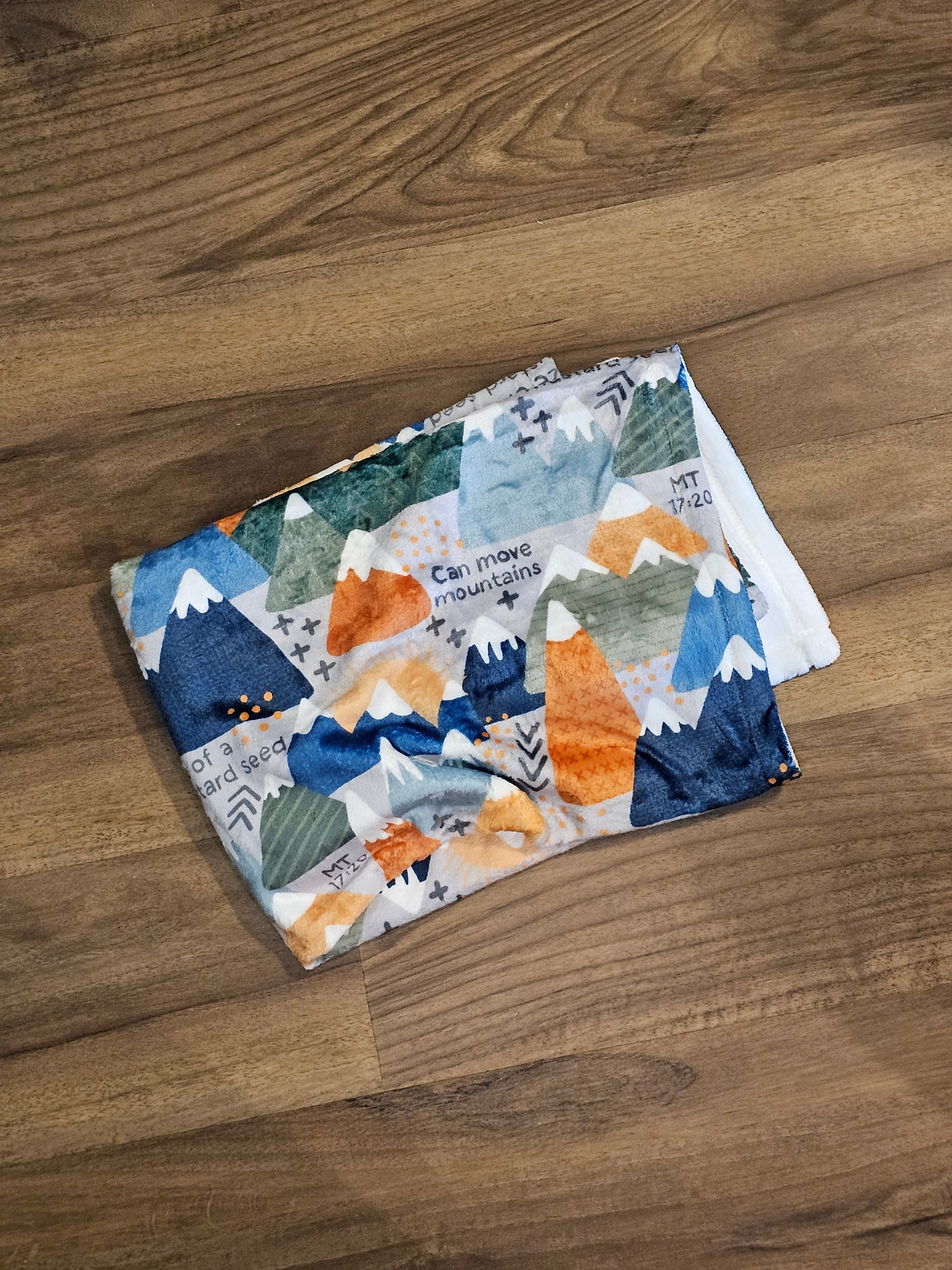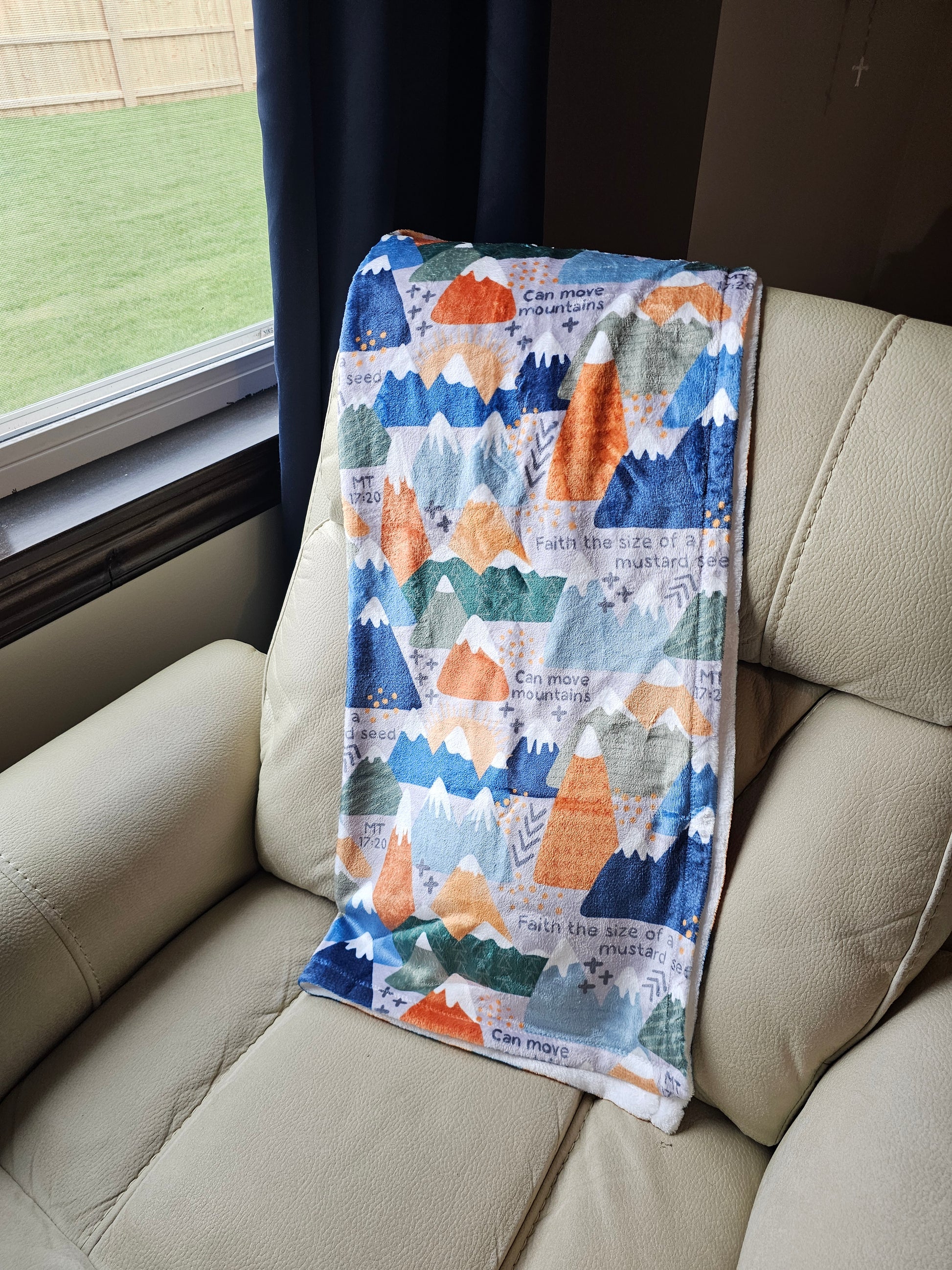 Blanket has fun mountain pattern with scripture inspiration from Matthew 17:20 - "He replied, 'Because you have so little faith. Truly I tell you, if you have faith as small as a mustard seed, you can say to this mountain, ‘Move from here to there,’ and it will move. Nothing will be impossible for you.”