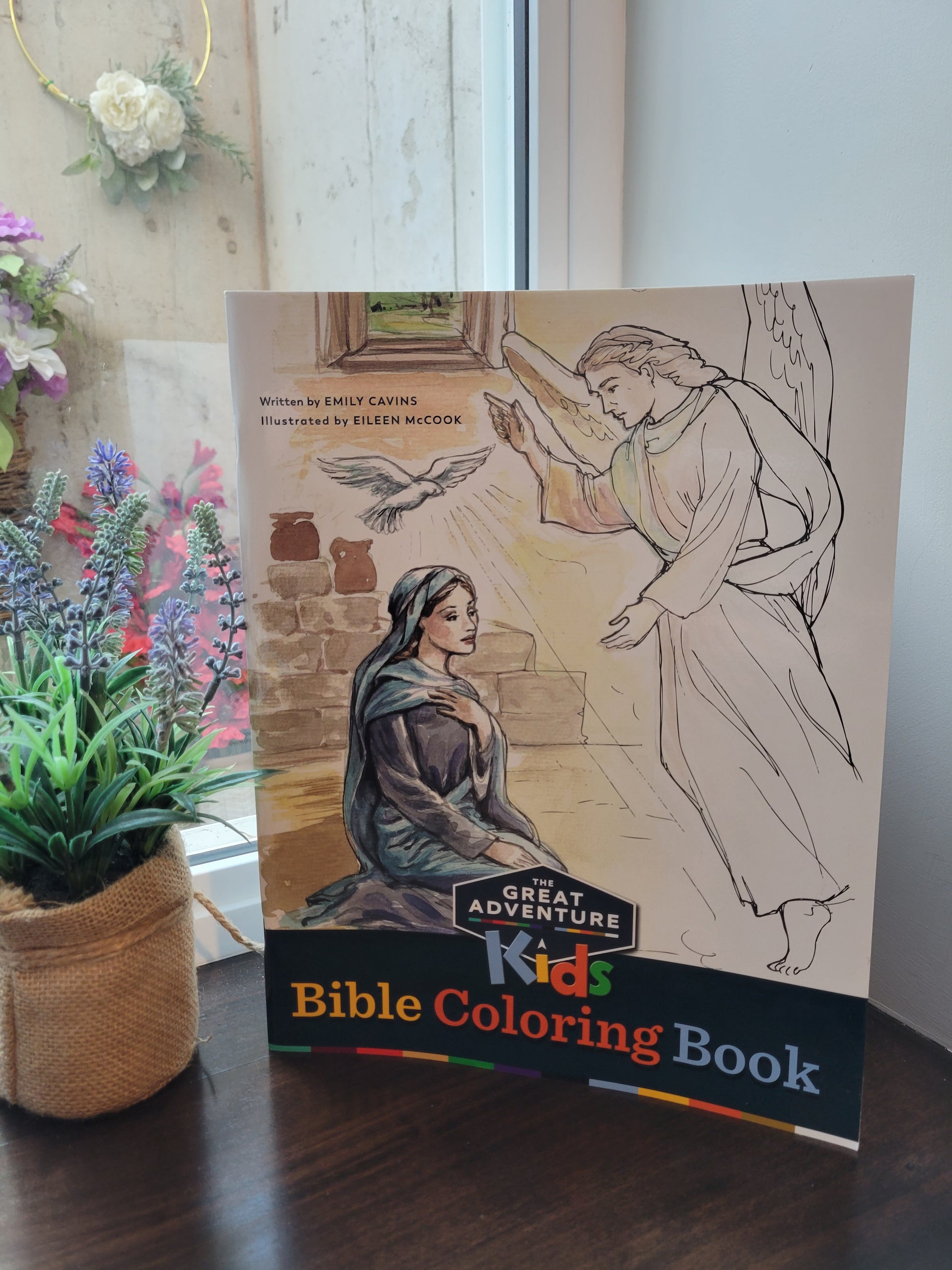 This 10’’ x 13’’ Bible Story Coloring Book includes almost fifty pages of illustrated Bible stories designed to help teach children the story of salvation history in chronological order.
