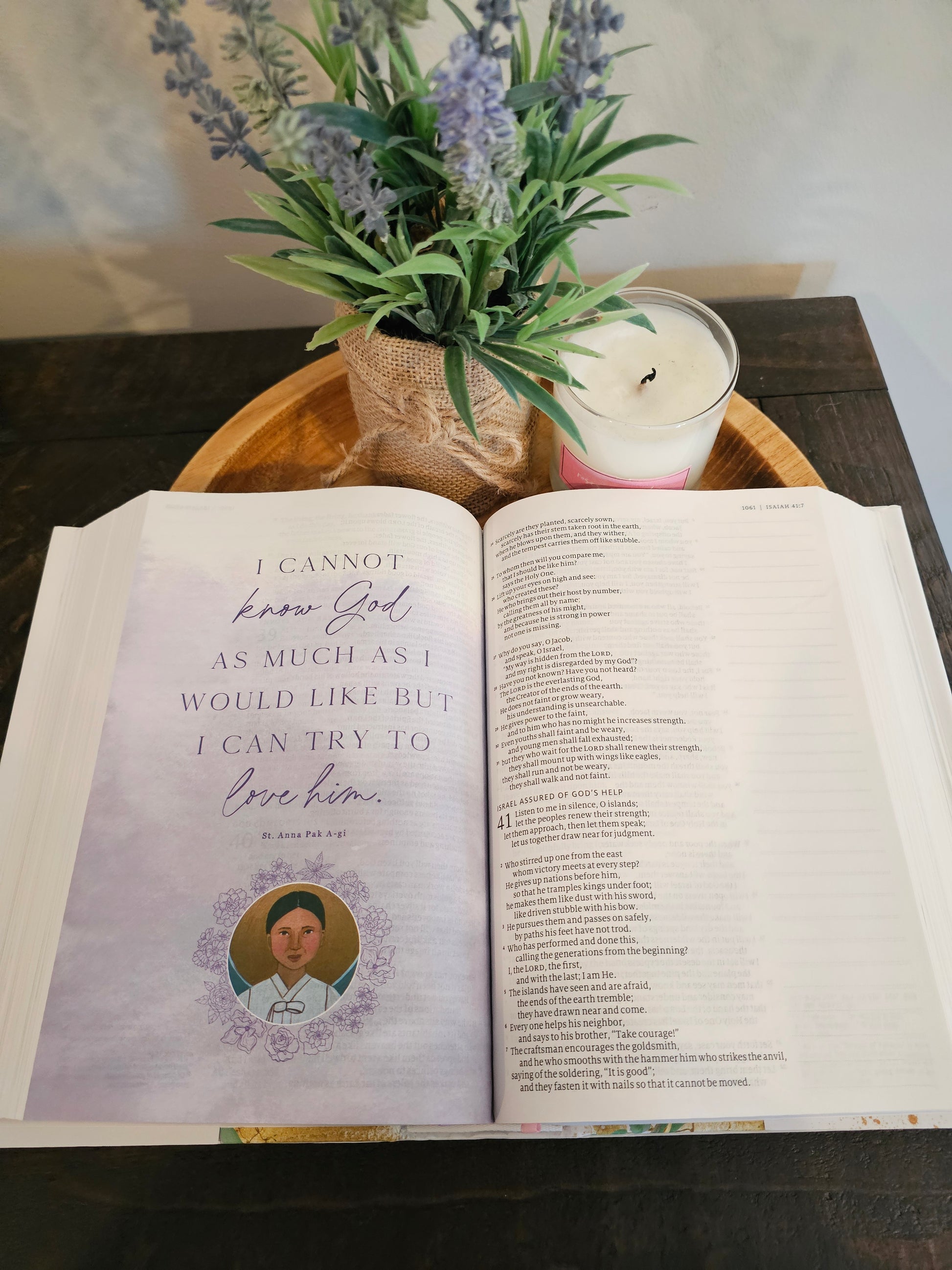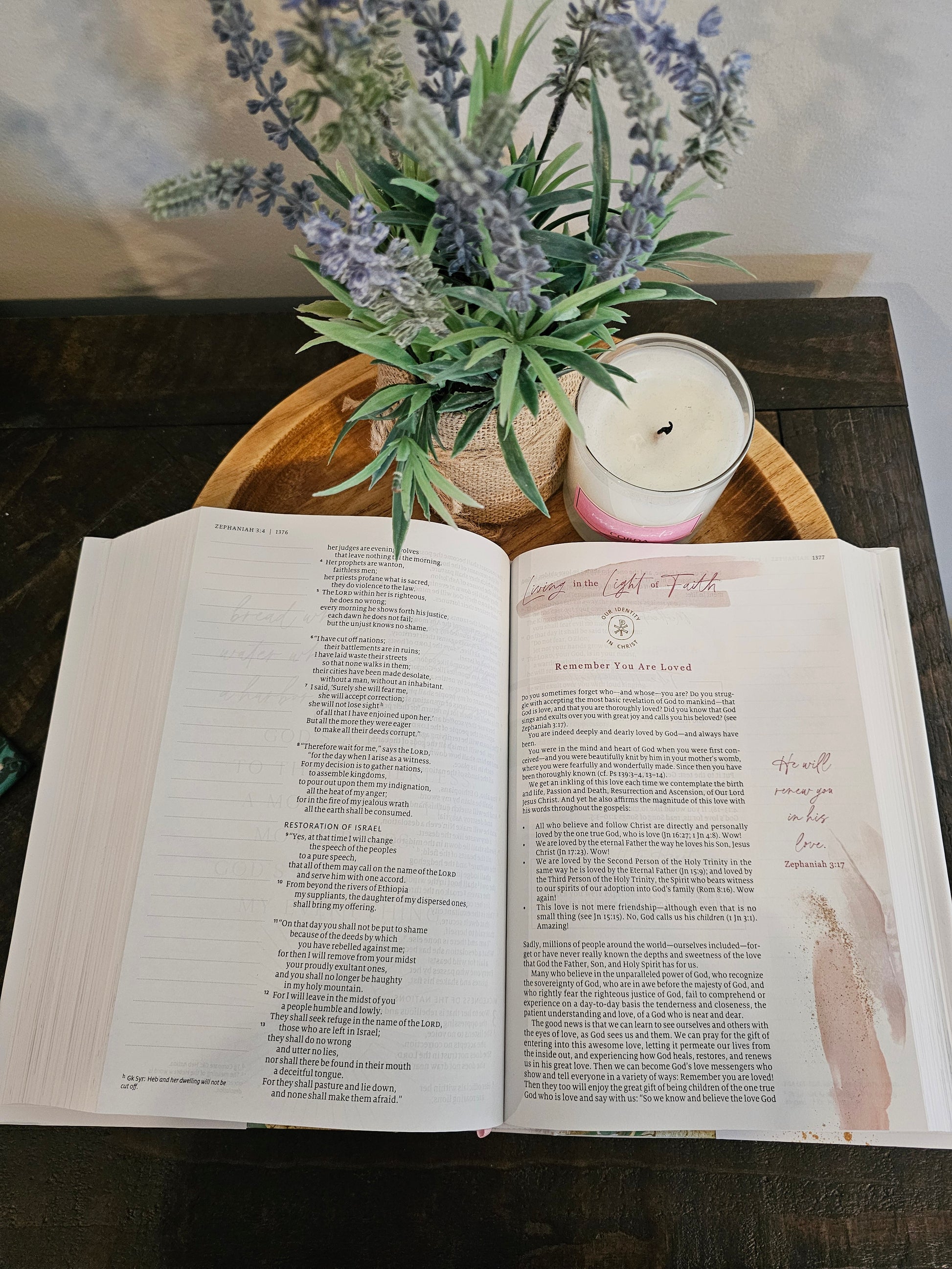The stunning beauty of the Living the Word Catholic Women’s Bible also makes it stand out among its peers. The extraordinary and elegant design enhances your reading experience by connecting various features throughout the text including fifty profiles of women in the Bible, ninety-seven Living in the Light of Faith essays, Take it to Heart questions for reflection and journaling, and quotations from saints and holy women. The tranquil colors and other design elements help you feel at home in the Bible.