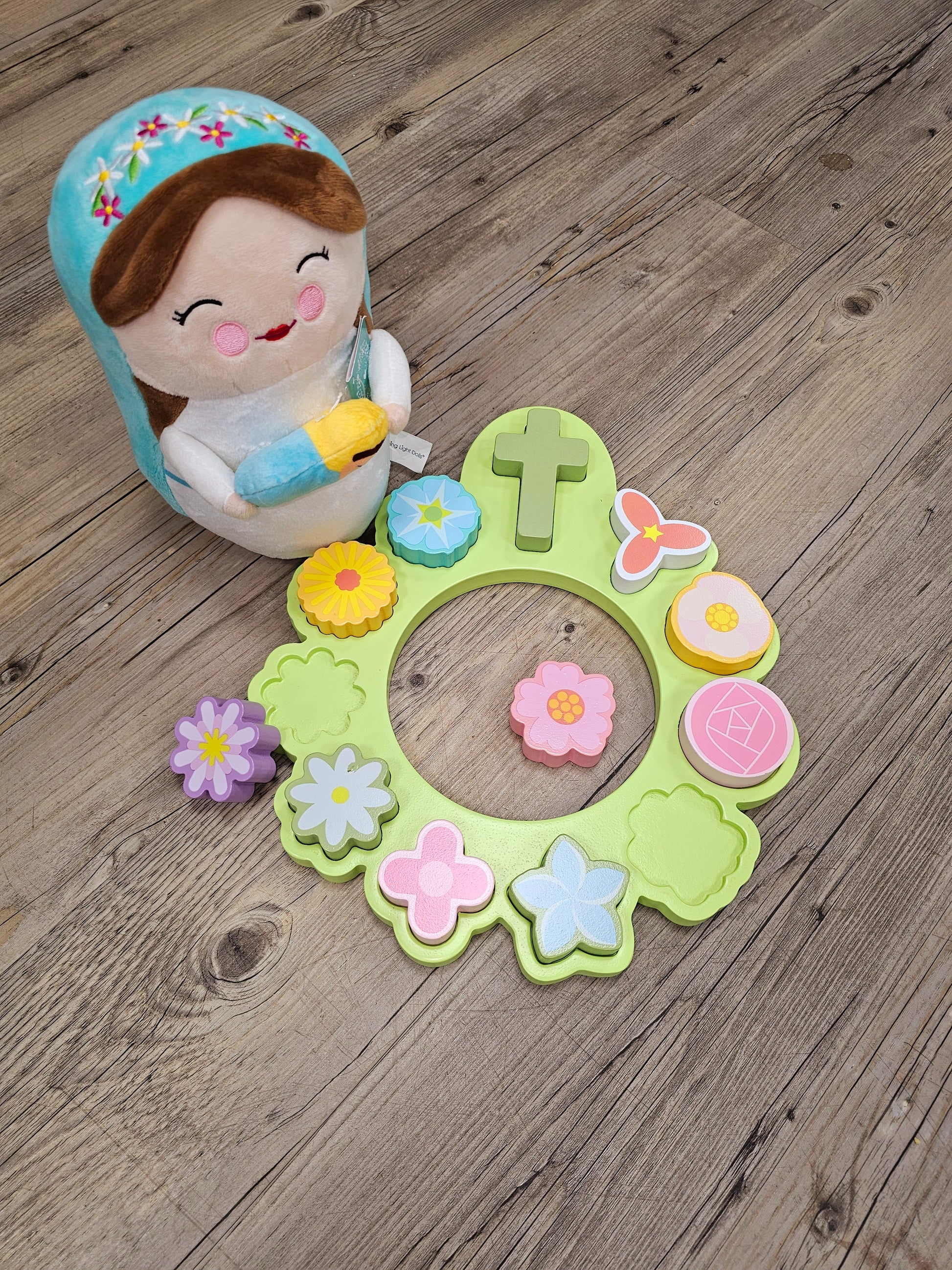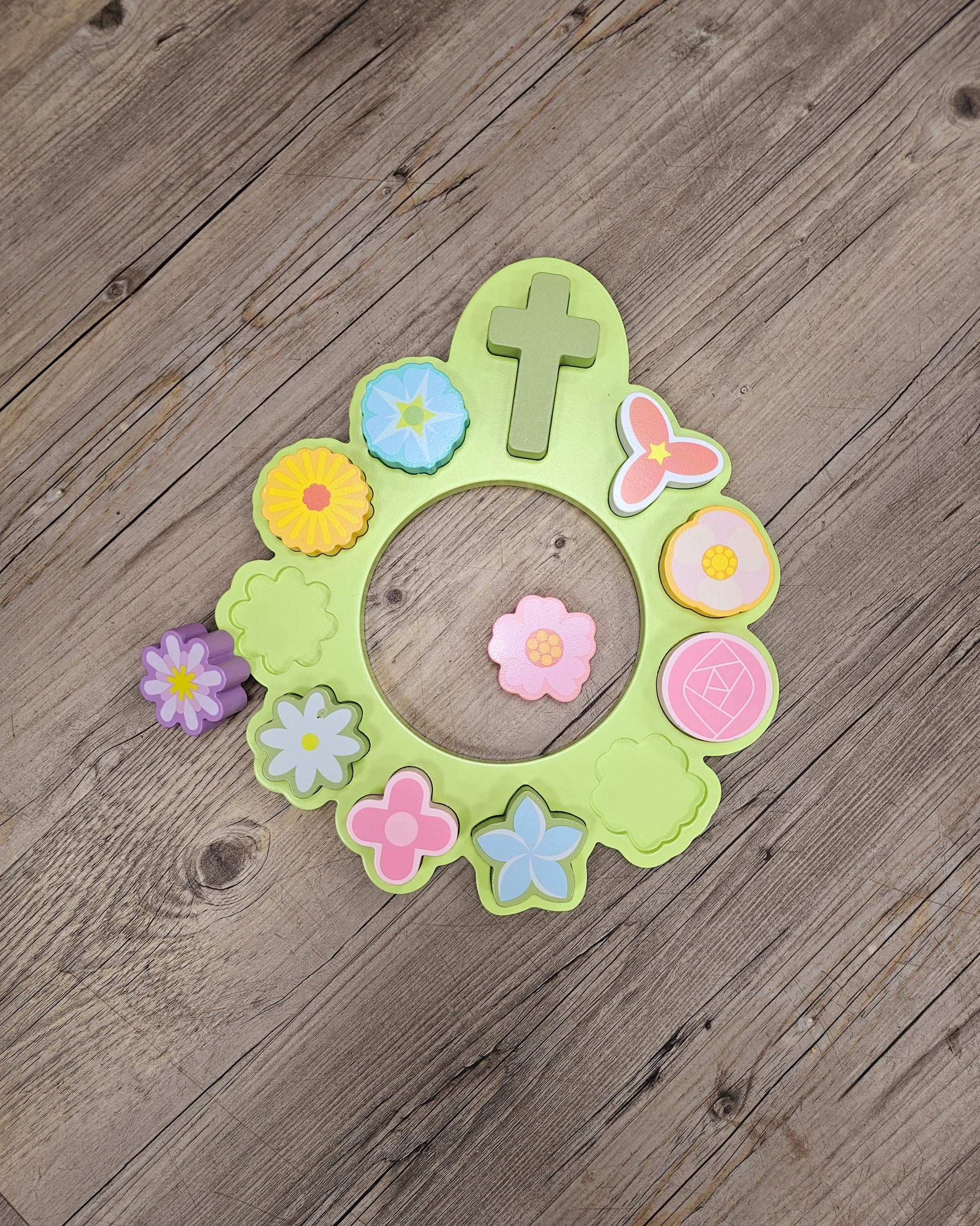 This beautiful Mary Garden Decade Rosary Puzzle is a lovely and unique way to encourage preschoolers to join in family prayer time- or anytime! This puzzle encourages patience and problem solving, as the pieces must be turned and re-positioned to fit in a specific way. Encourage development in patience, perseverance and frustration tolerance. A great next step puzzle after our Decade Rosary Ball Set!