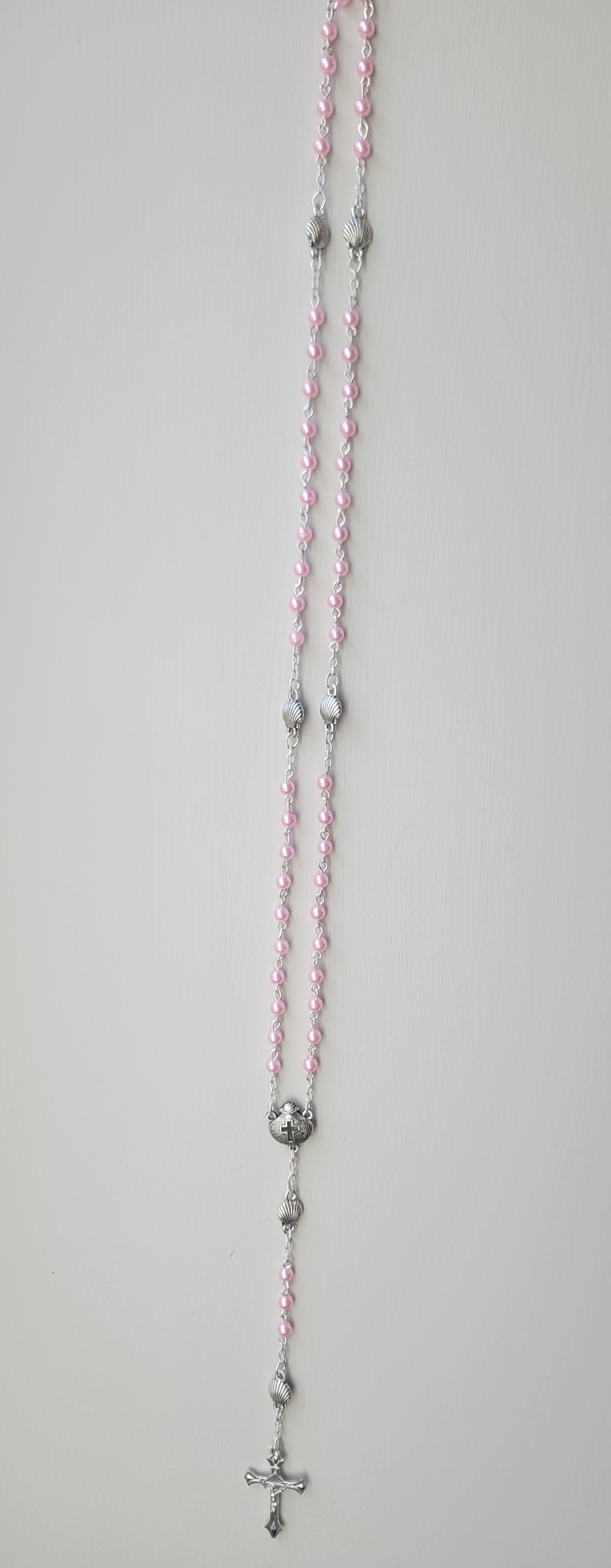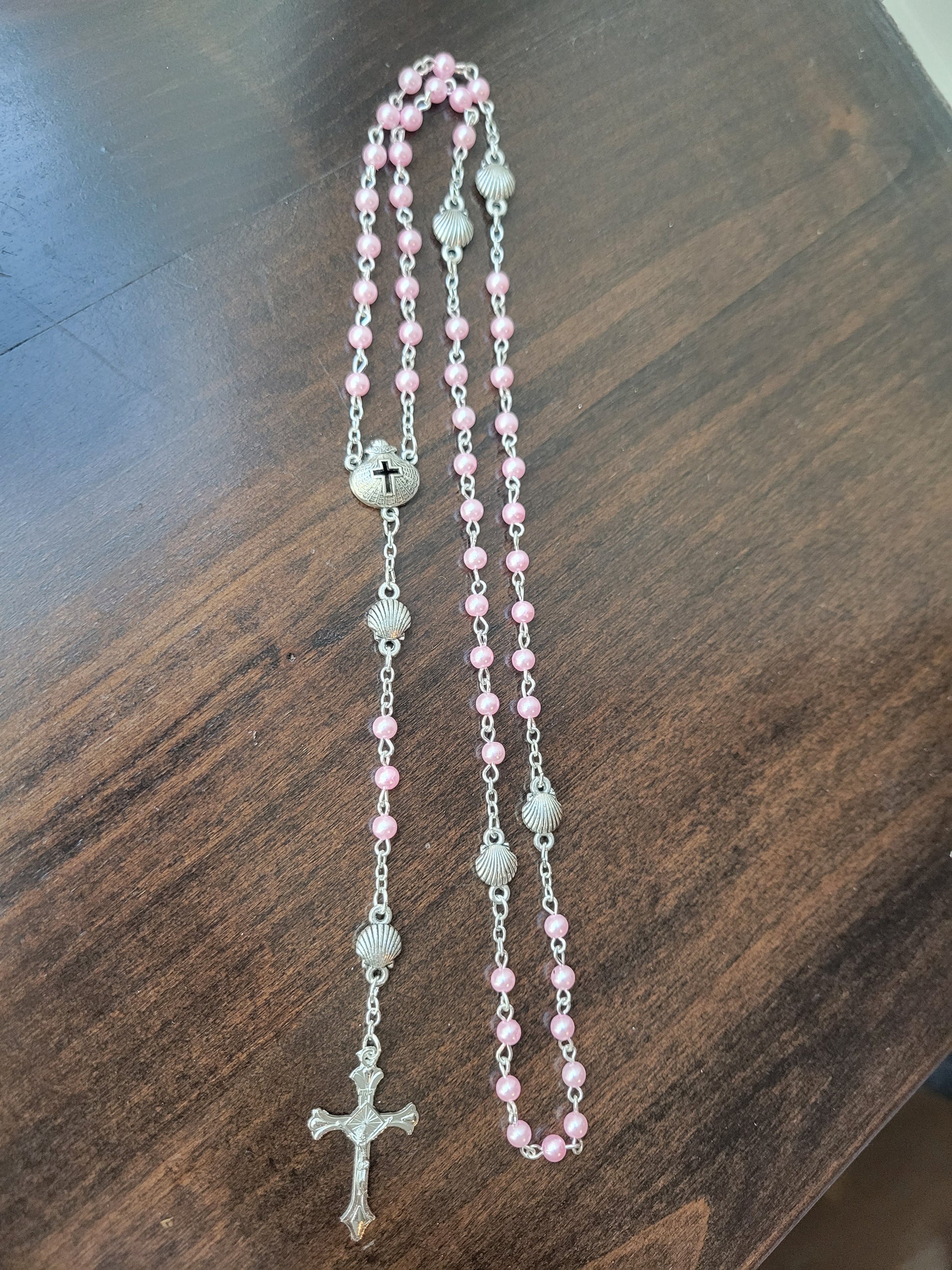 4mm Pink Pearl Beads with silver ox Baptism Shell, Our Father Beads and center.