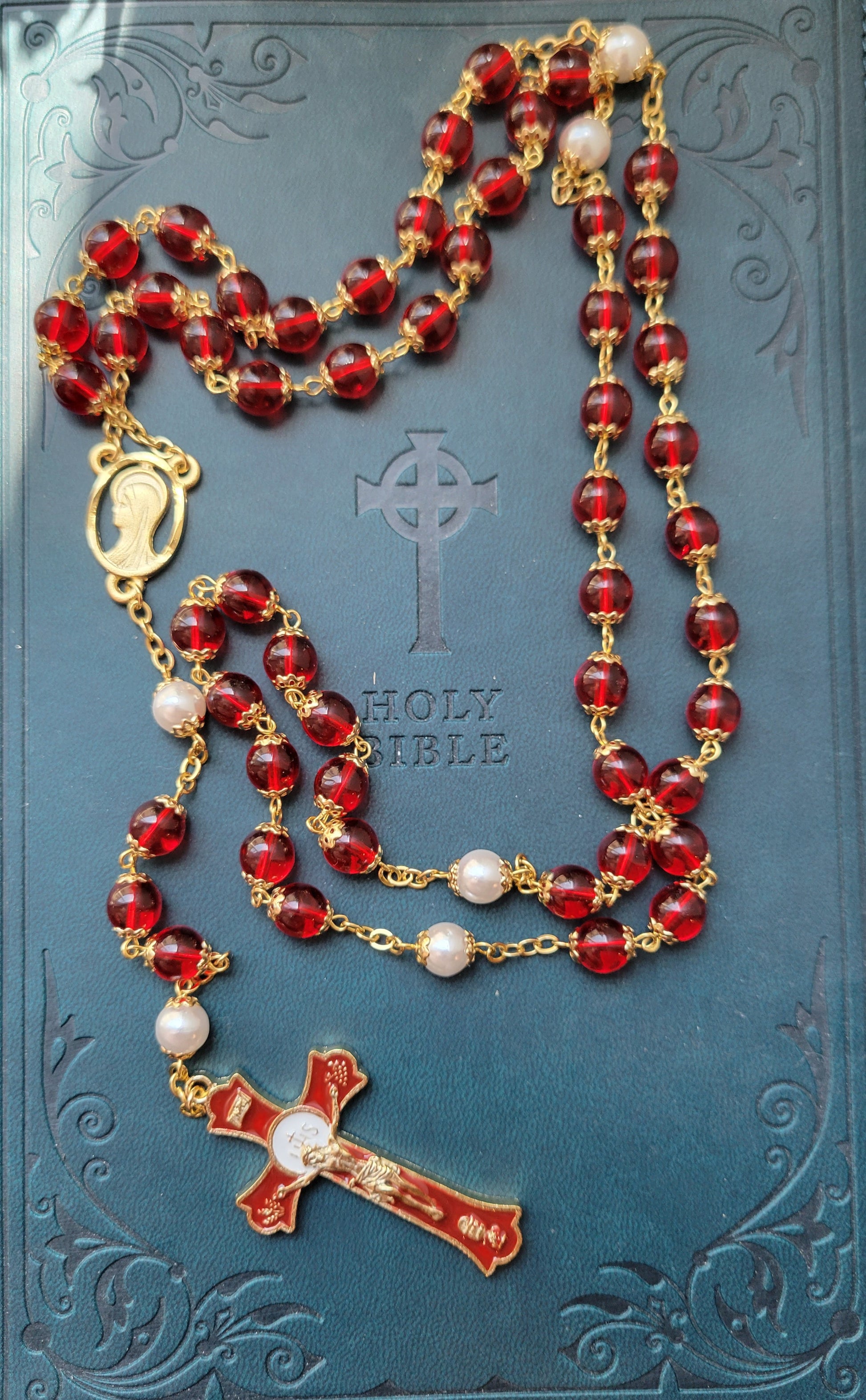 8mm gold plated pewter red and pearl capped glass rosary with Holy Mass red epoxy crucifix, and miraculous center.