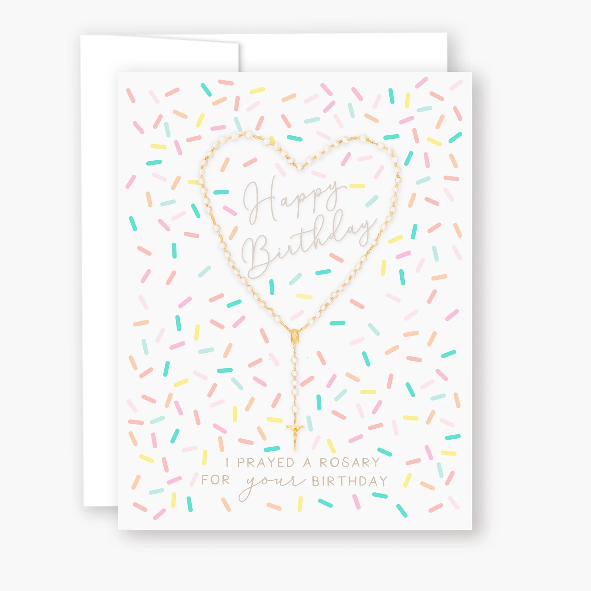 - Front of Card: Rosary in the shape of a heart with the words "Happy Birthday" surrounded by birthday sprinkles