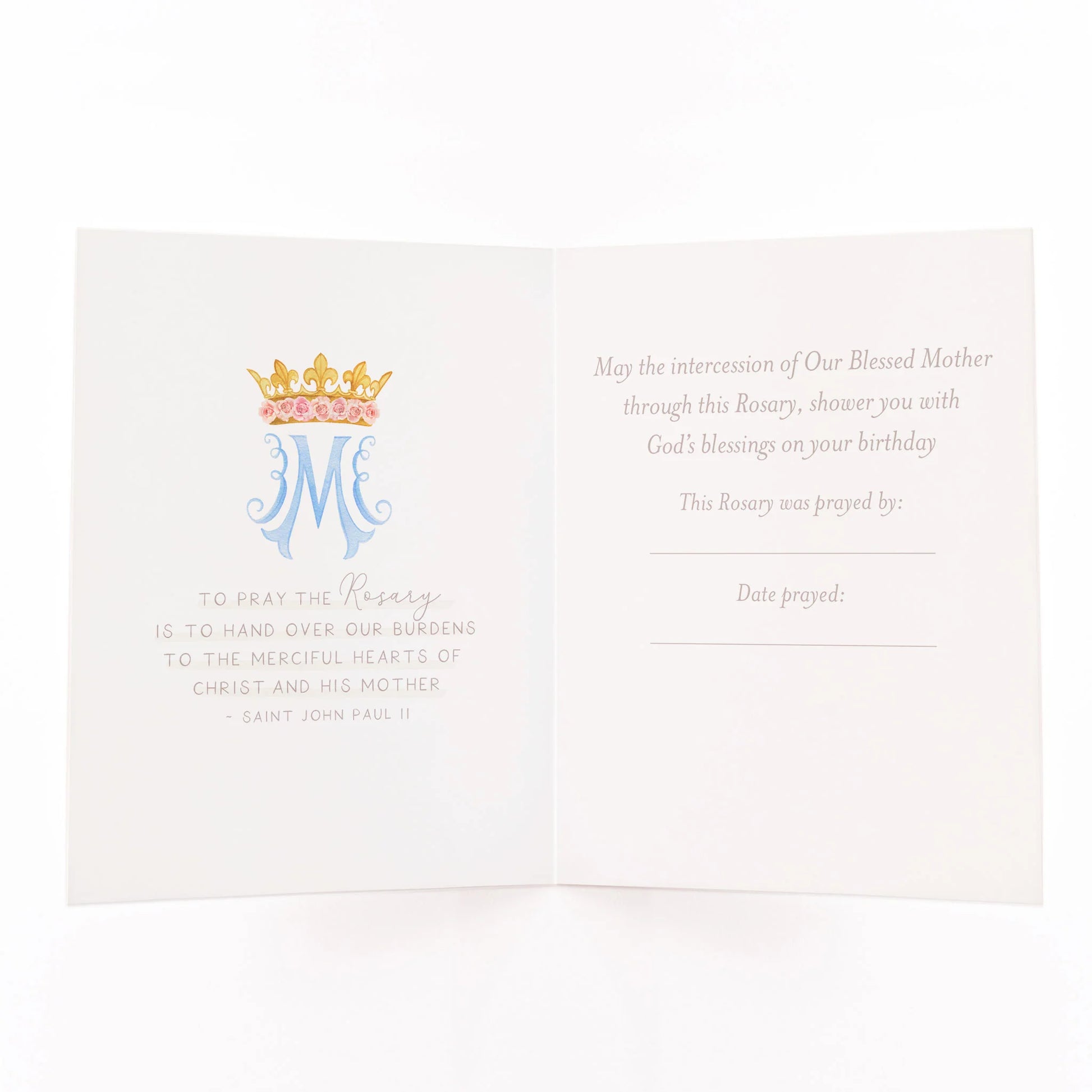 The watercolor print on the front of the card is of a colorful birthday sprinkles, surrounded by a Rosary in the shape of a heart. The inside artwork depicts the crowning of the Marian "M" with roses, commonly associated with the Rosary, and a quote by St. John Paul II - "to pray the Rosary is to hand over our burdens to the merciful hearts of Christ and his Mother".