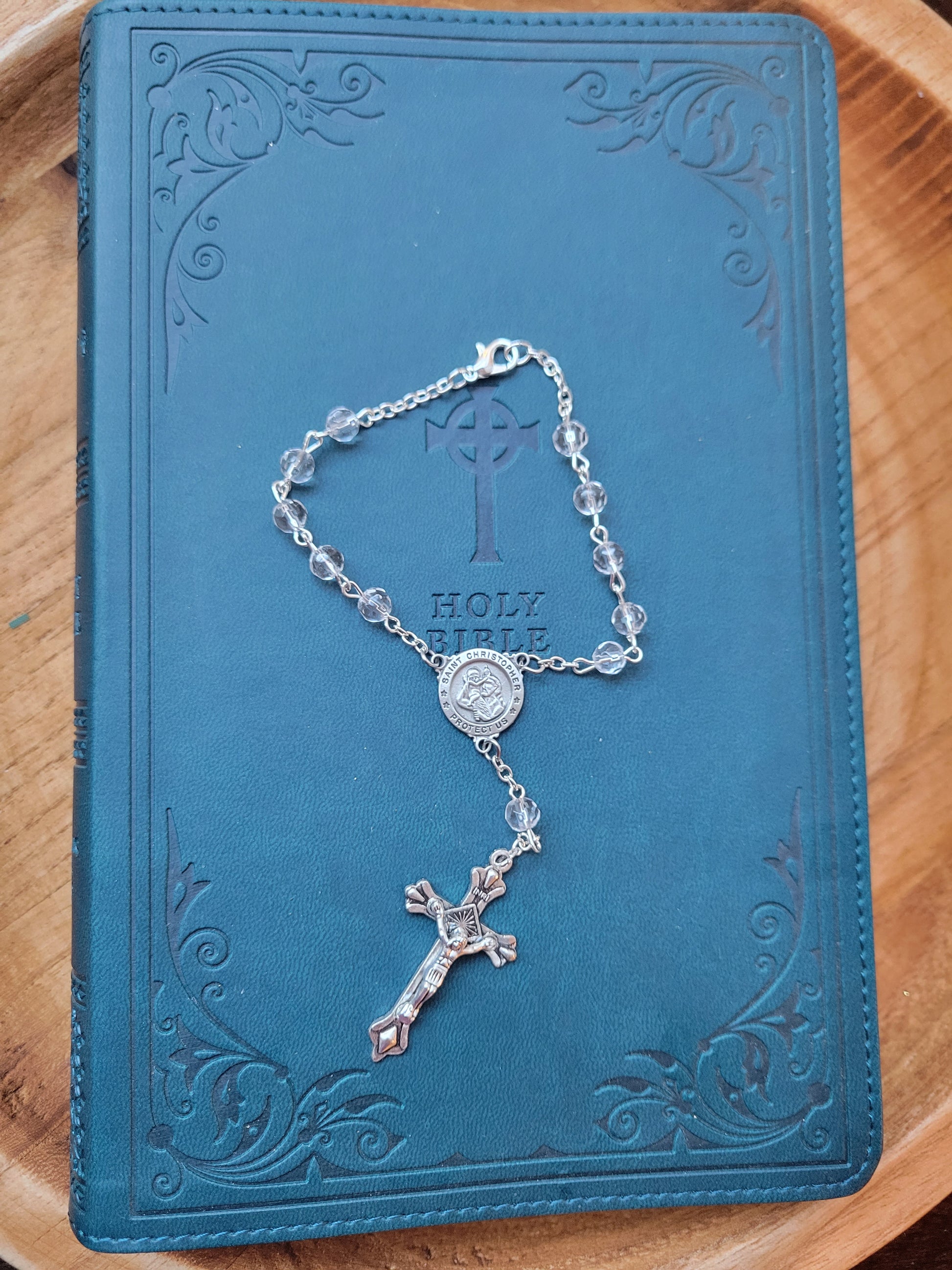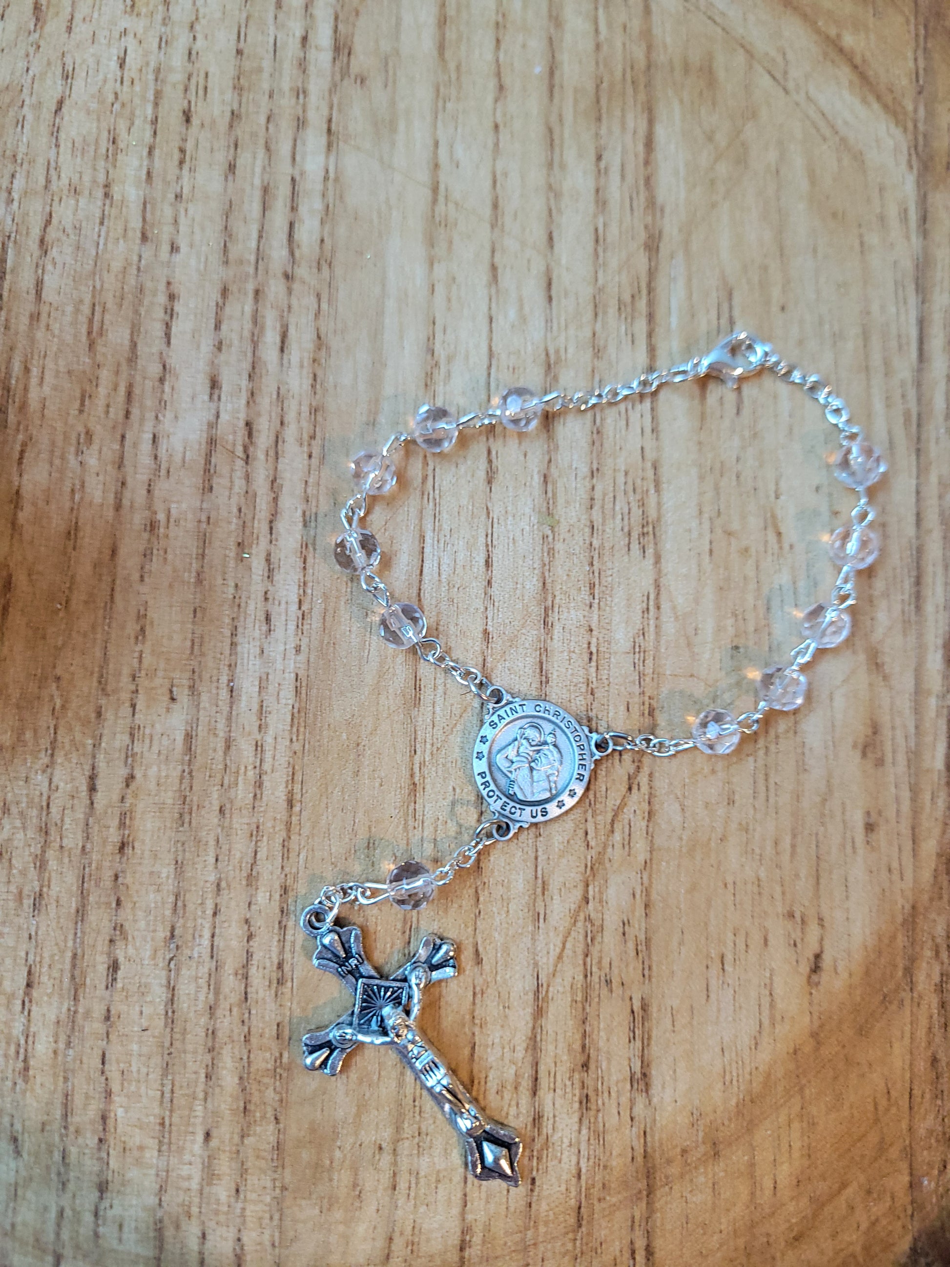 St. Christopher Auto Rosary with clear crystal beads. Take it with you in your car, in your purse or keep it in your pocket.