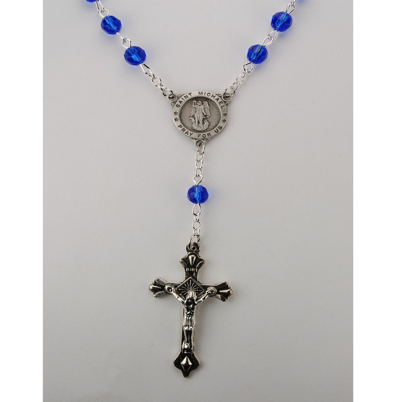 St. Michael Auto Rosary with blue beads.